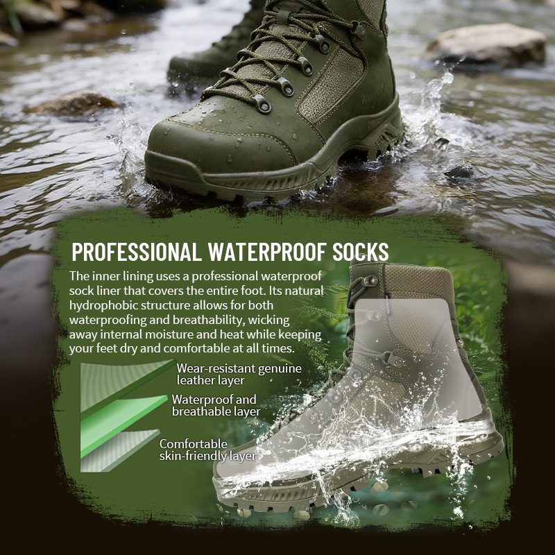 Η εσωτερική επένδυση χρησιμοποιεί μια επαγγελματική αδιάβροχη κάλτσα που καλύπτει όλο το πόδι. Η φυσική του υδρόφοβη δομή κρατά το νερό έξω ενώ αφήνει τη θερμότητα και τον ιδρώτα να διαφύγουν—έτσι ώστε τα πόδια σας να παραμένουν στεγνά και άνετα.
